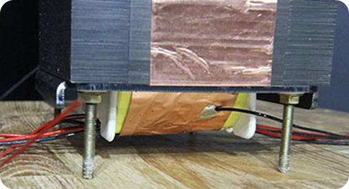 Let's take a look at how transformer vibrations are controlled when installing a large-capacity transformer within the limited space of an audio case. A clearance of 8mm is maintained so that no part of the transformer directly contacts the audio case. This gap is sufficient to block the transformer's vibrations. Check out how this spacing method effectively controls the core's vibrations.